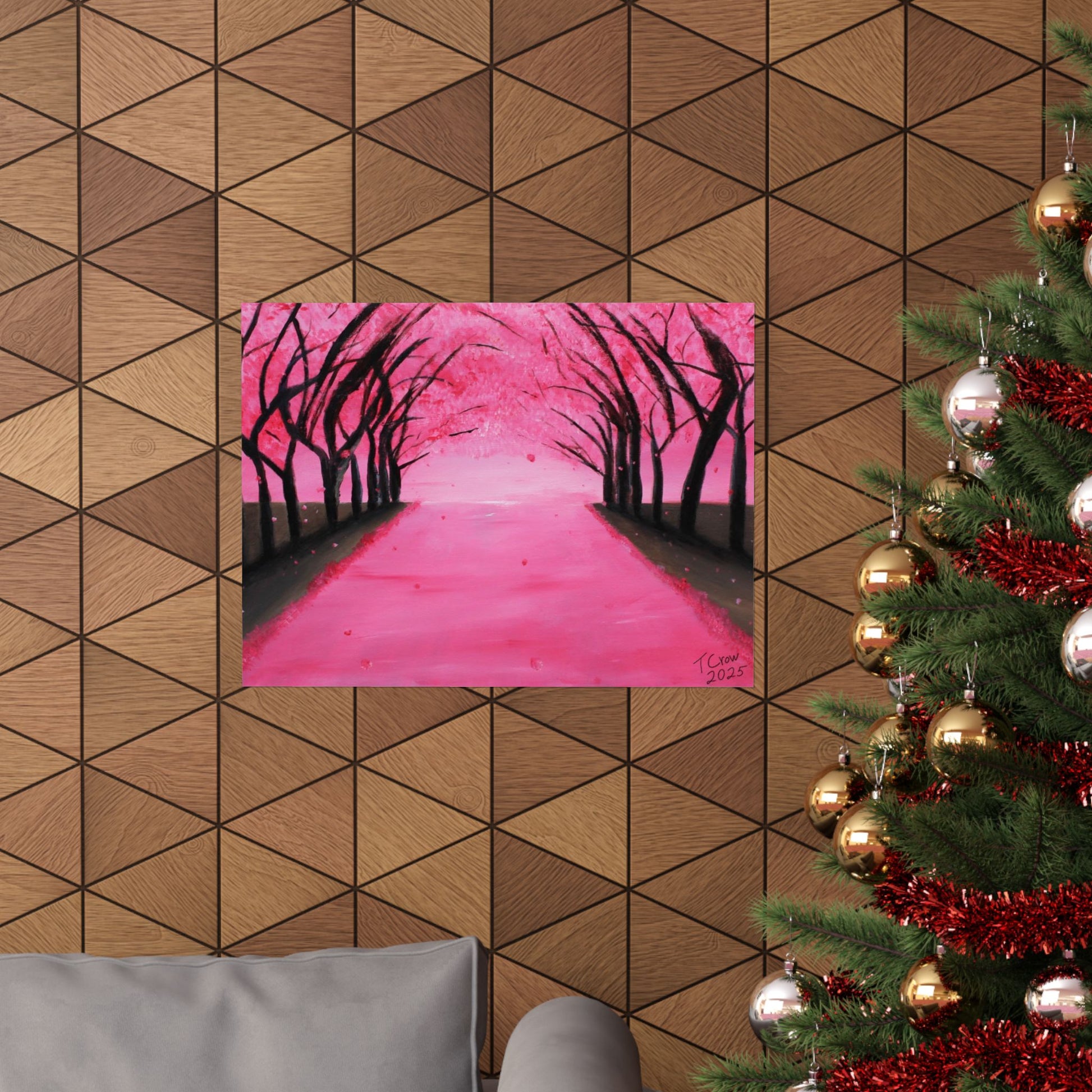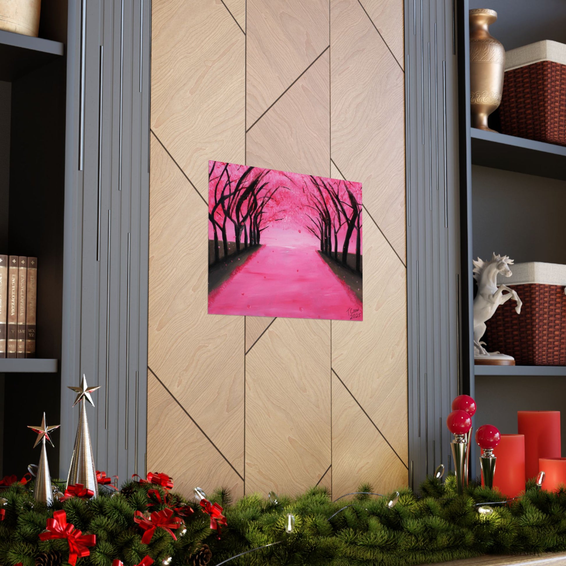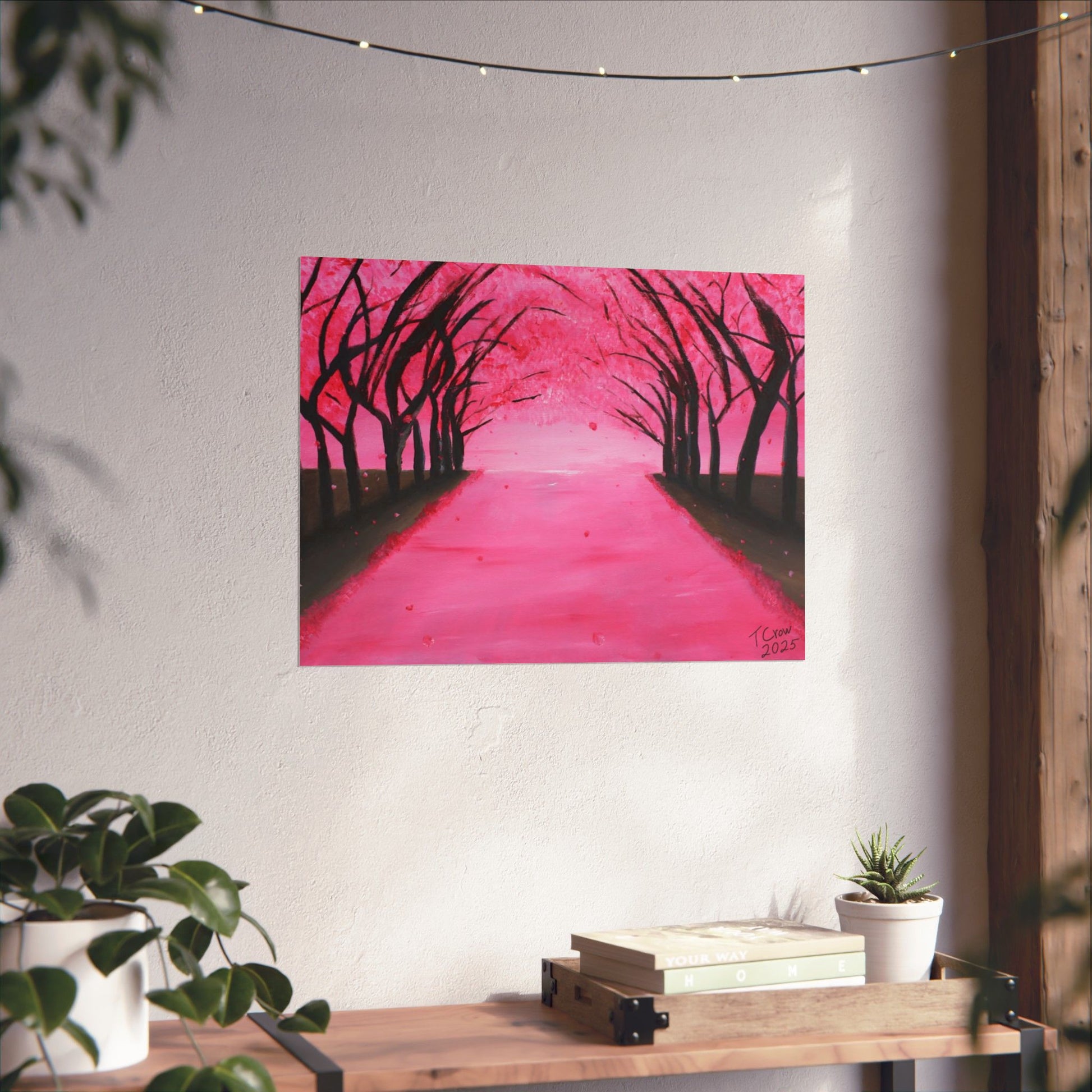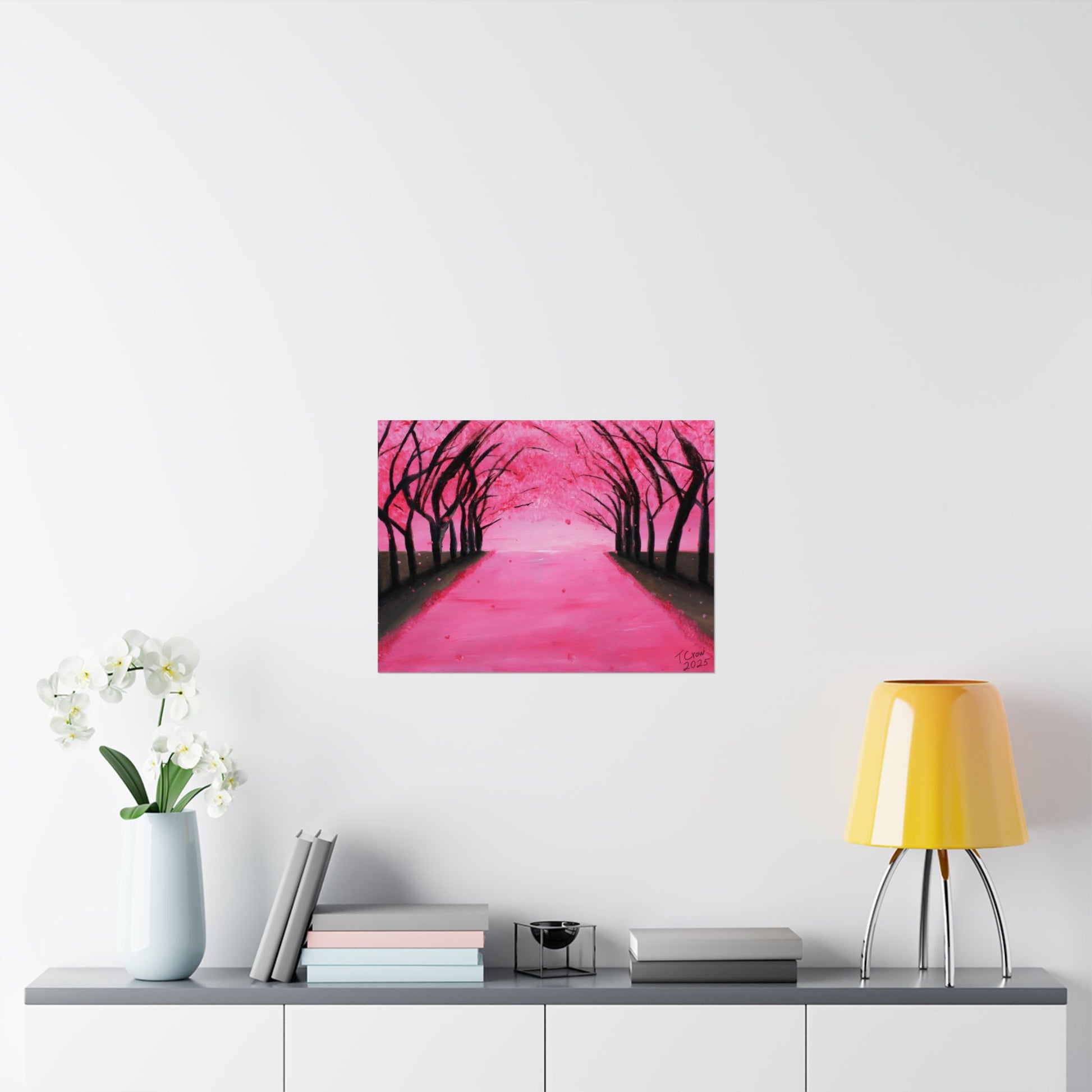A soft, museum-quality poster that brings a serene pink canopy into your space. Printed with long-lasting giclée inks on archival matte paper, the piece captures the quiet hush of a tree-lined path dusted in blossoms. The matte finish absorbs light for a velvety look that reduces glare and deepens color saturation, so the vibrant pinks and inky silhouettes hold their presence on a living room wall or cozy reading nook. With a wide range of sizes and heavyweight archival stock, this poster is made to hang indoors and keep its color and clarity over time.