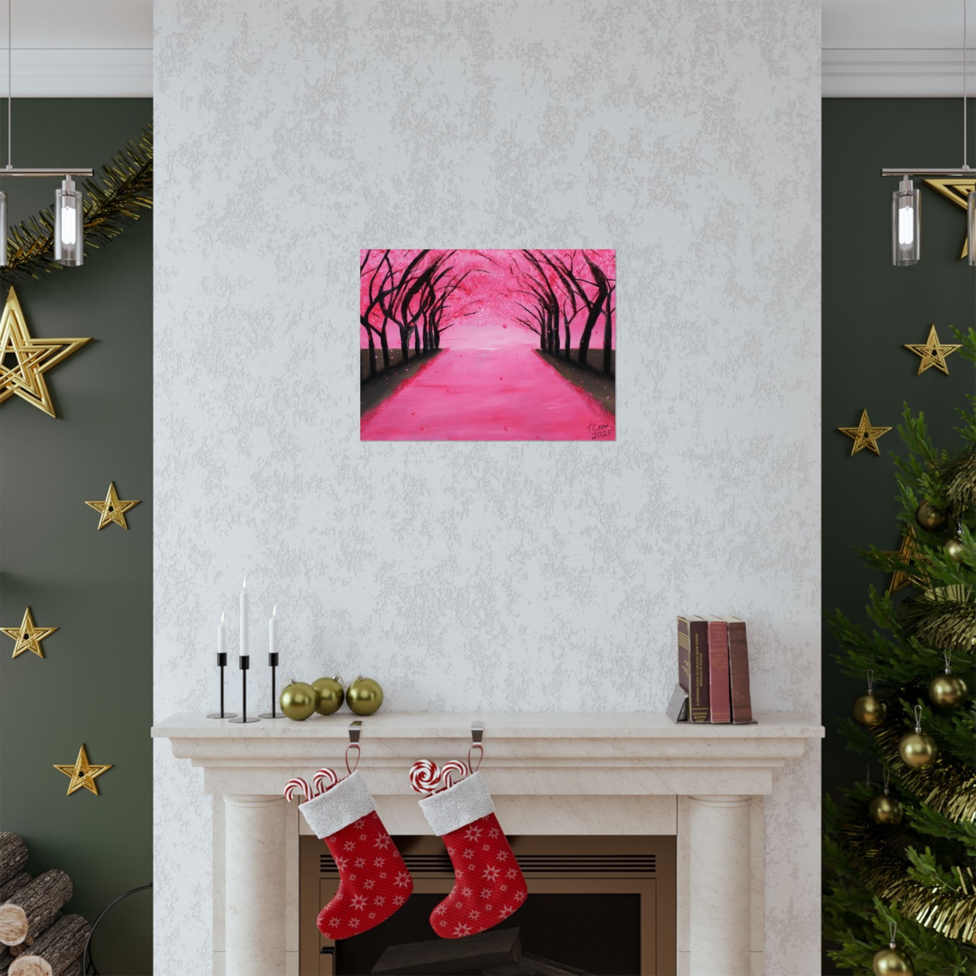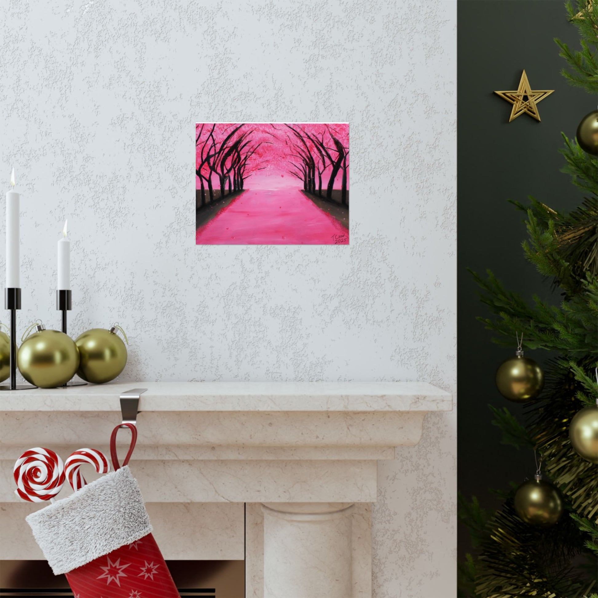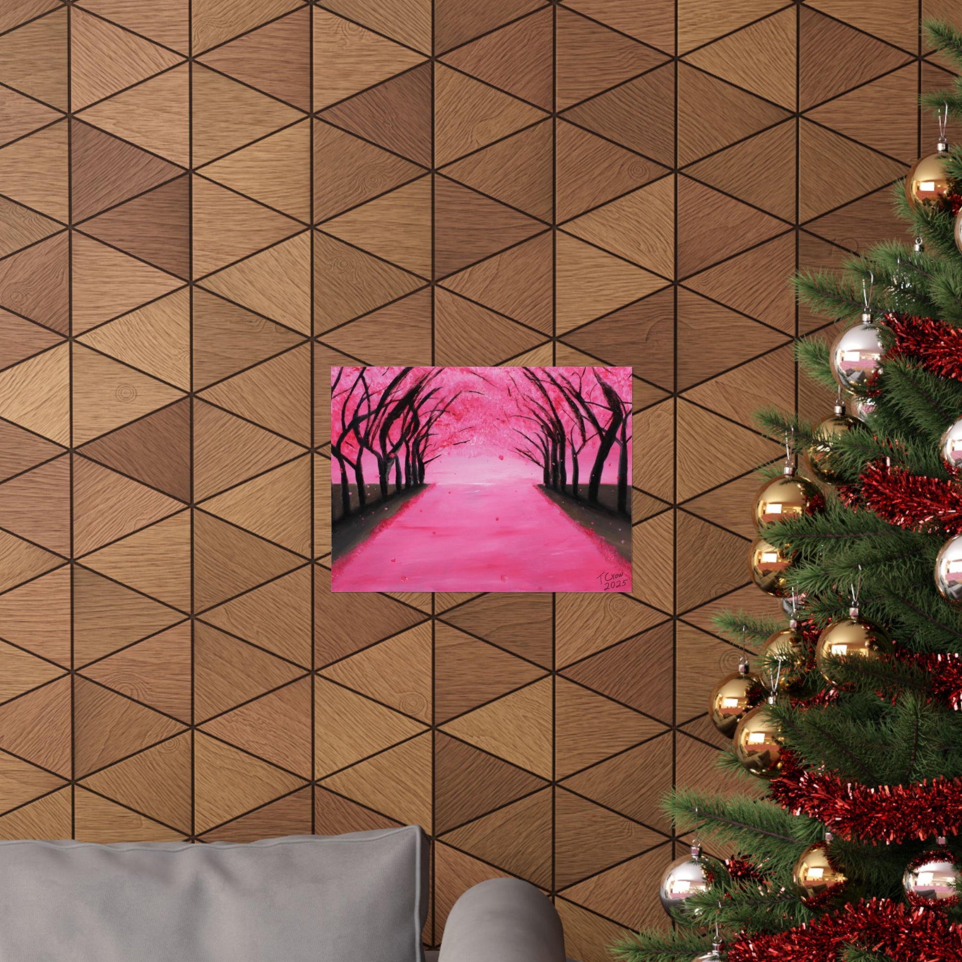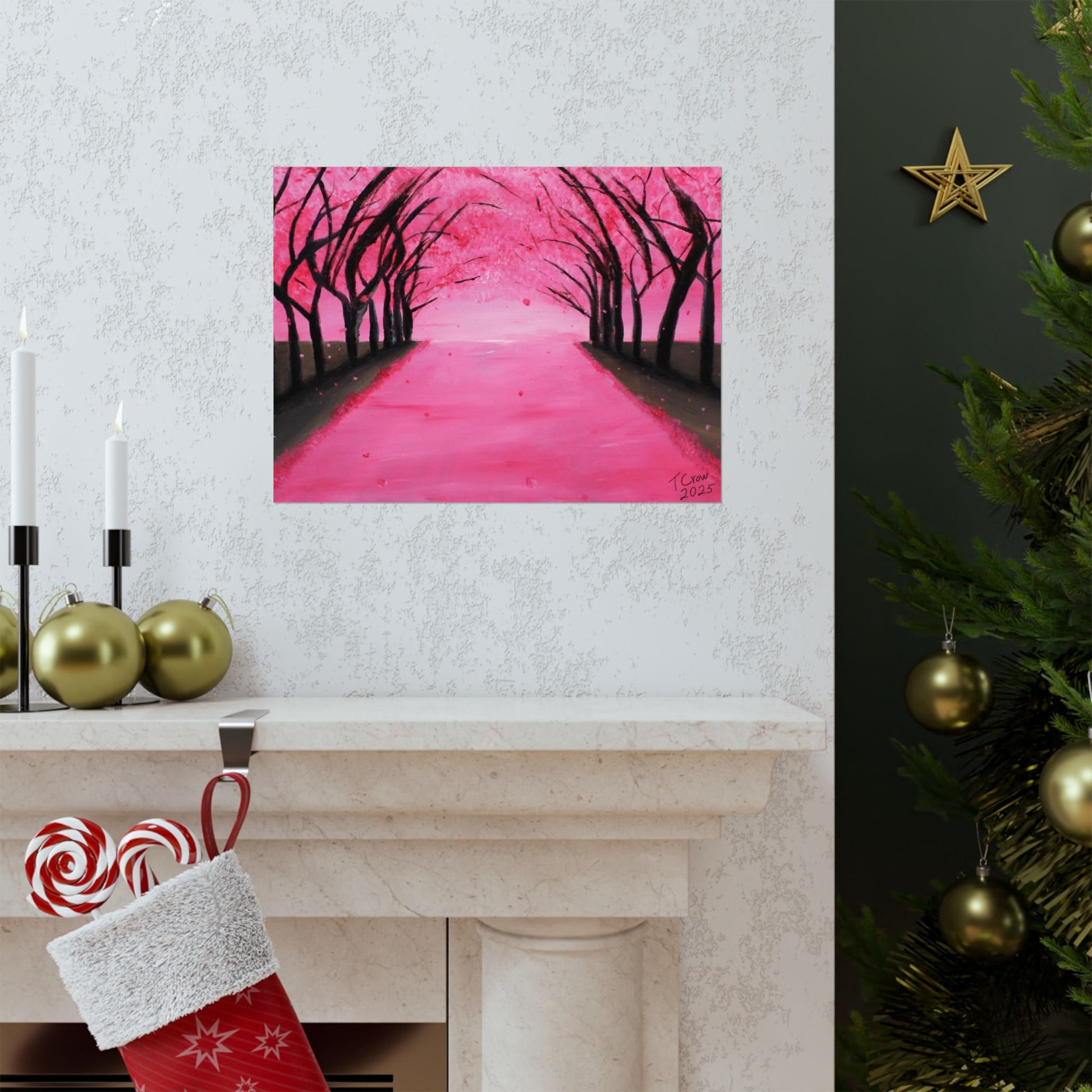 A soft, museum-quality poster that brings a serene pink canopy into your space. Printed with long-lasting giclée inks on archival matte paper, the piece captures the quiet hush of a tree-lined path dusted in blossoms. The matte finish absorbs light for a velvety look that reduces glare and deepens color saturation, so the vibrant pinks and inky silhouettes hold their presence on a living room wall or cozy reading nook. With a wide range of sizes and heavyweight archival stock, this poster is made to hang indoors and keep its color and clarity over time.