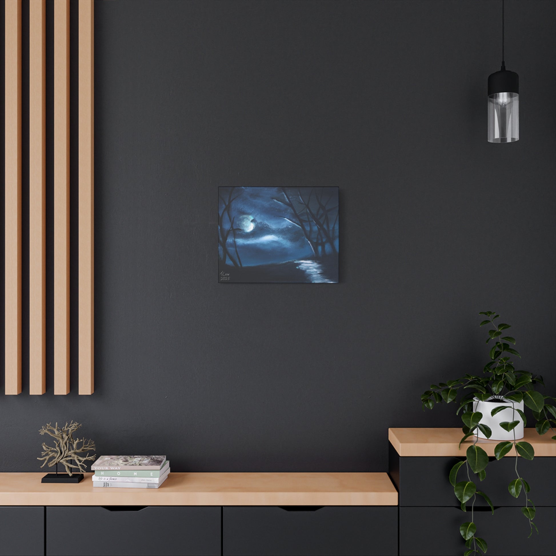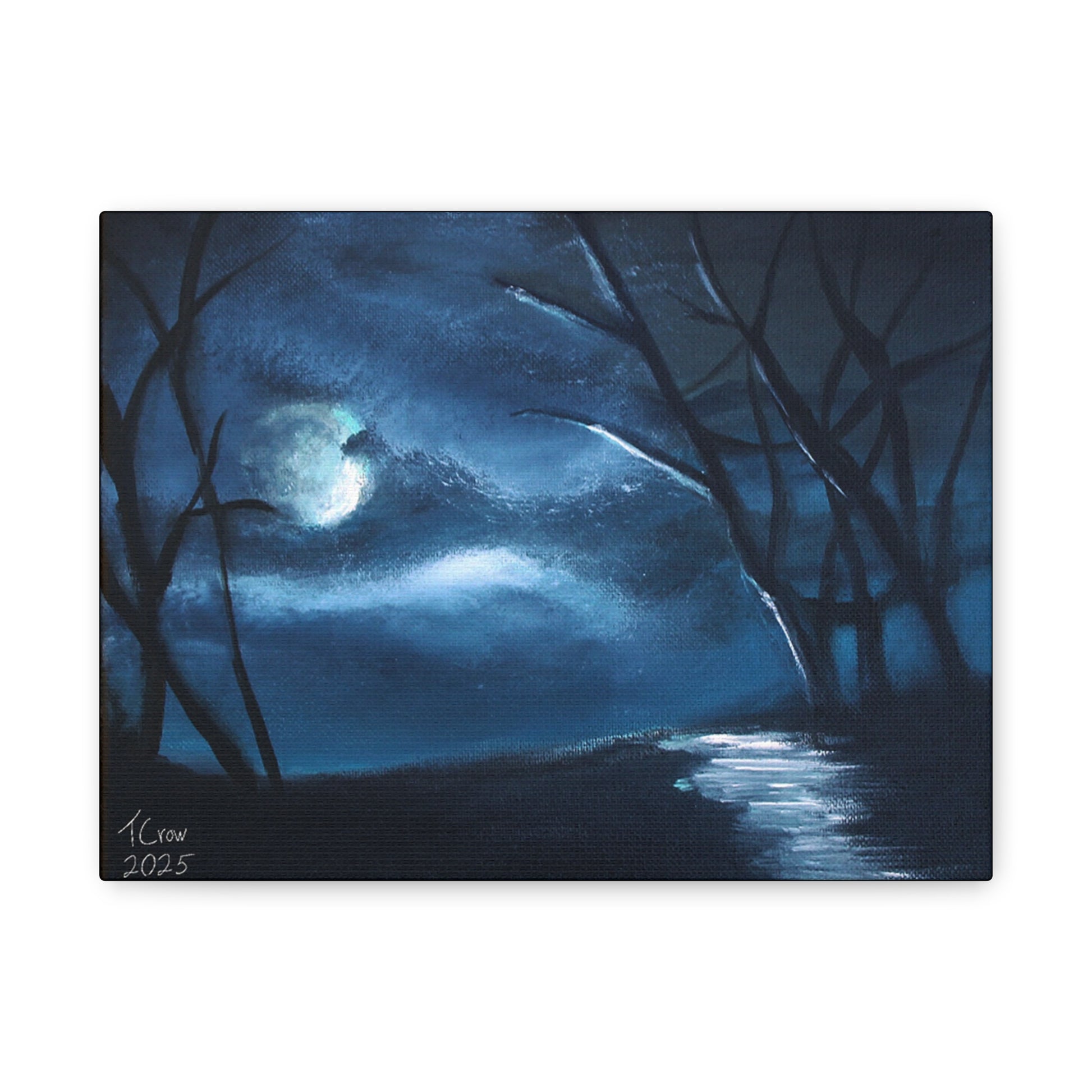 Enhance your space with this stunning matte canvas art piece, designed to evoke a tranquil atmosphere. Featuring a surreal night scene with moonlit reflections, it's perfect for anyone seeking to bring a touch of the serene outdoors into their home. This canvas art fits seamlessly in living rooms, bedrooms, or offices, offering a calming presence wherever it’s placed. Ideal for art lovers, nature enthusiasts, or anyone looking to celebrate life's quiet moments, this piece is a thoughtful gift for birthdays, housewarmings, or holidays such as Christmas and Thanksgiving. Transform your walls into a tranquil retreat with this elegant artwork!